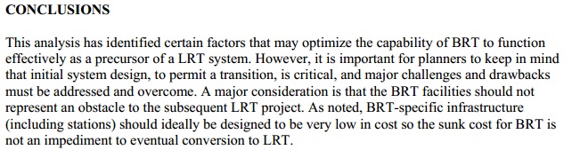 Paper concludes that best-practices approach to plan for BRT or RapidBus as precursor to rail is to design it for eventual conversion from the start. This means keeping infrastructure investment minimal and designing for modularity (i.e., designing station components, communications, etc. so they can be easily relocated or reconfigured for the rail mode during conversion).