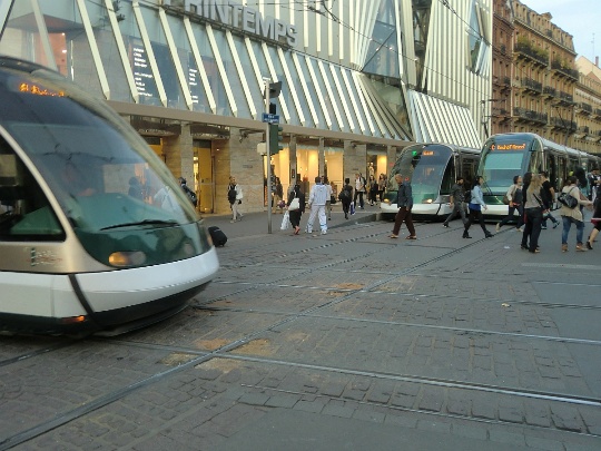 Opened in 2004, Houston’s MetroRail runs 7.5 miles with 16 stations through the heart of the city, from University of Houston–Downtown to Fannin South, using well-separated reservations created by re-allocating former traffic lanes and turning (“chicken”) lanes to rail transit. It’s highly successful, carrying 37,500 rider-trips per average weekday (second quarter 2013) at about 8% lower cost per passenger-mile than Houston’s bus system average (National Transit Database, 2011).