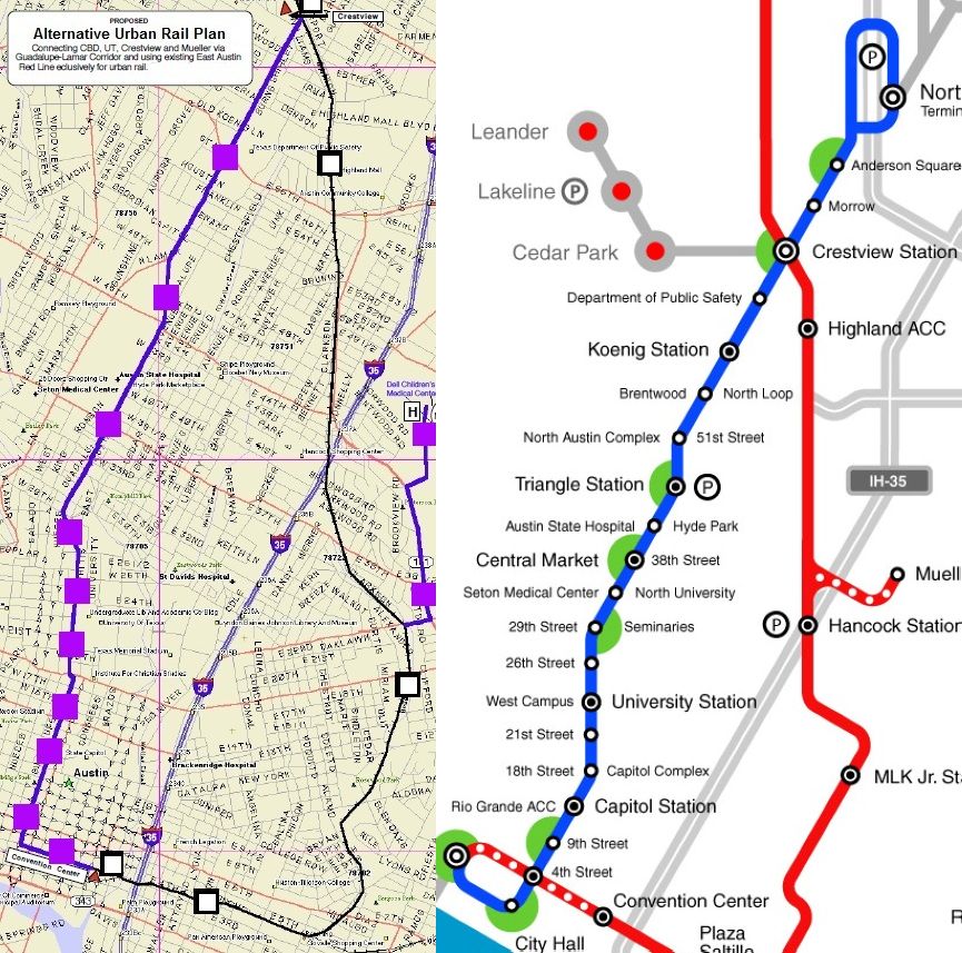 From the standpoint of the engineering design of its alignment, MetroRail presents a model of what could be possible in Austin’s Guadalupe-Lamar (G-L) corridor. Facing the constrained street right-of-way available, Houston’s local decisionmakers and planners bit the bullet, opting to re-allocate entire street lanes away from motor vehicle traffic, and allot the space to the much higher carrying-capacity of the planned new LRT line.