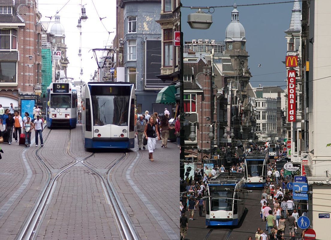 Two views of the Leidsestraat. LEFT: A #1 tram, heading away from camera, has just left the interlaced section onto double track, passing a #5 tram headed toward the camera and the interlaced section. (Photo: Stefan Baguette) RIGHT: You can see the steady stream of trams, sometimes just a couple of minutes apart, passing the heavy flows of pedestrians on each side. (Photo: Mauritsvink)