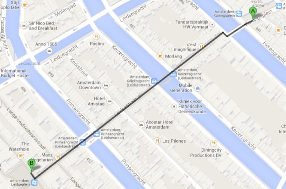 Leidsestraat alignment runs about 500 meters (0.31 mile) in length, passing over several canals. Map: Dave Dobbs (from Google Maps).