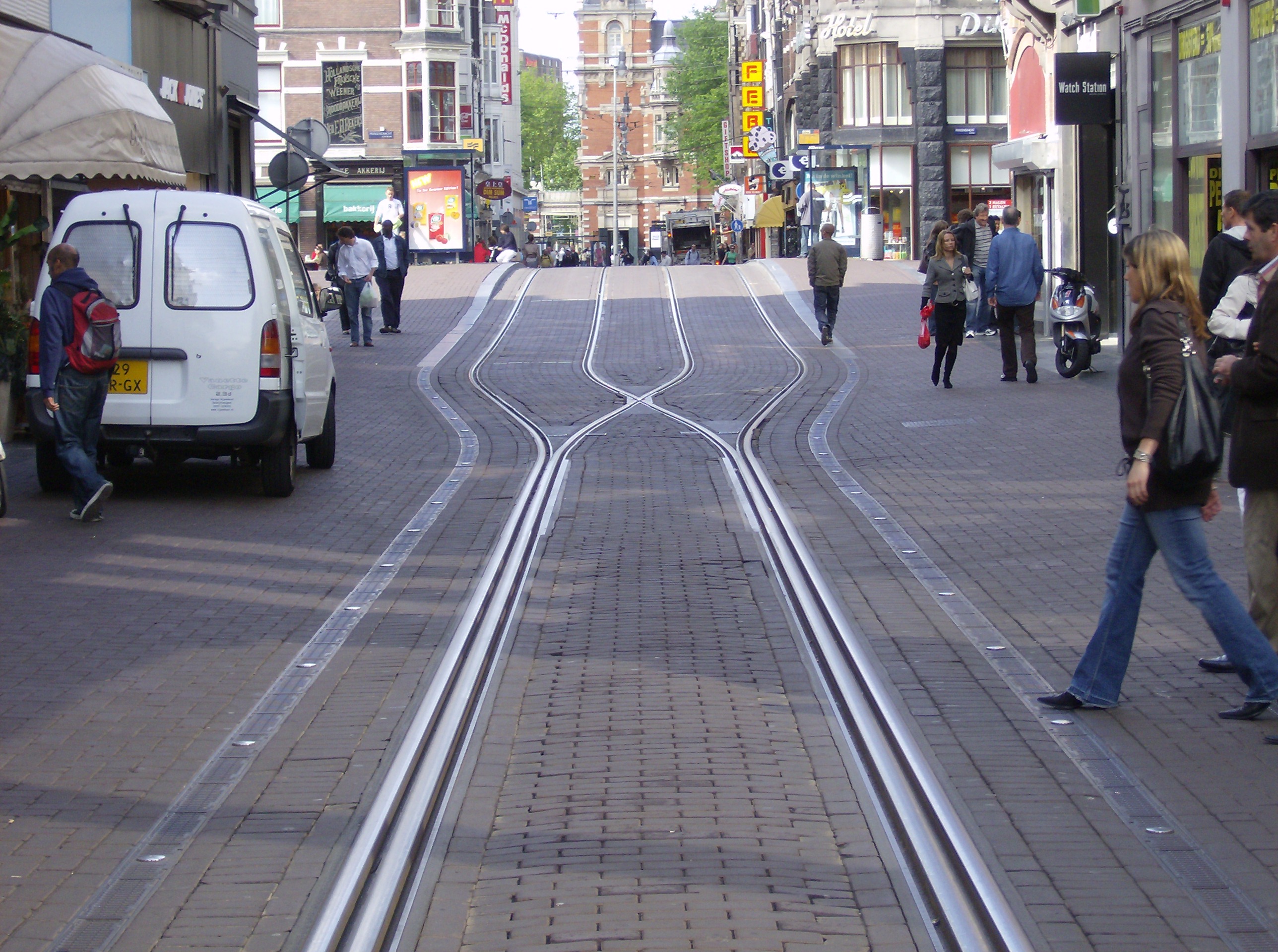 To expand on what Lyndon has explained about dealing with constrained rights-of-way (ROW) and the use of interlaced or gauntlet track, probably it’s helpful to focus on perhaps the most famous example — the Leidsestraat, a very narrow street in Amsterdam. This is a city filled with trams (aka streetcars, light rail).