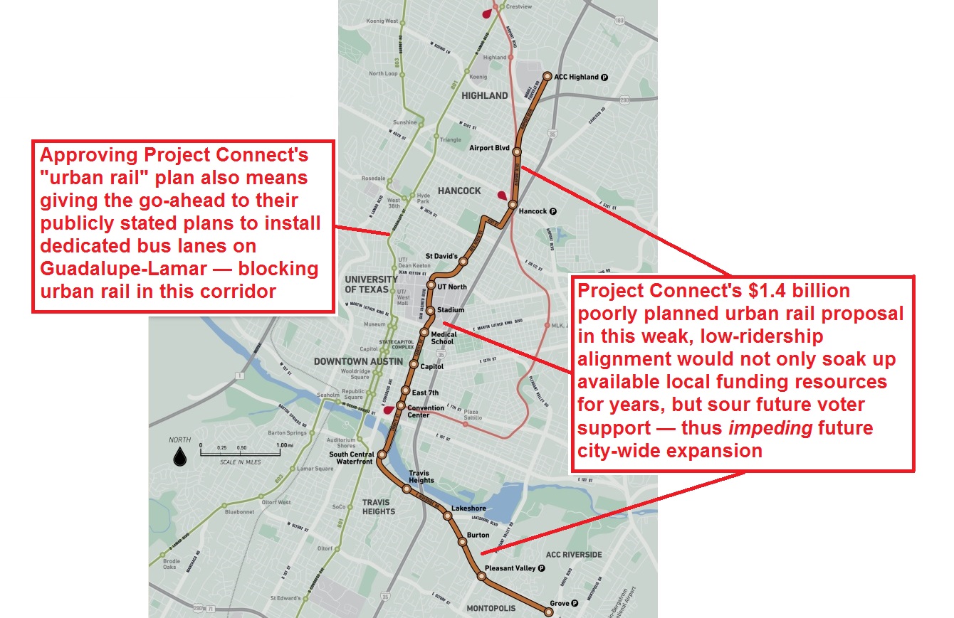 Project Connect’s claim of “congestion relief” is especially implausible when you further consider that they’re expecting prospective urban rail passengers to slog their way through the I-35 congestion, then, just a few minutes from their destination, to exit the freeway, hassle with parking, wait for a train, and then take a long, slow, sinuous train ride into the Core Area — a route that includes entering Airport Blvd., navigating through mixed traffic on Red River St., then winding through San Jacinto Blvd. and other streets comprising this tortuous “Highland” route.