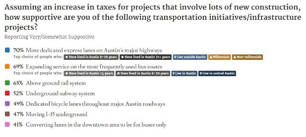 As the graphic at top shows, respondents also gave a thumbs-up to “More dedicated express lanes on Austin’s major highways ” and “Expanding service on the most frequently used bus routes”. And over half apparently even favor a subway.