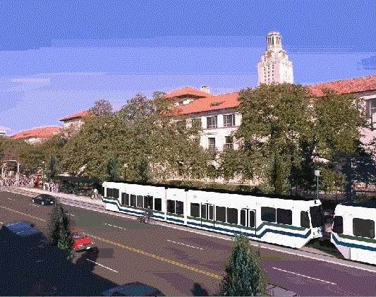 Rendition of LRT train on Guadalupe (the Drag) passing UT campus. Graphic: Capital Metro, via Light Rail Now.
