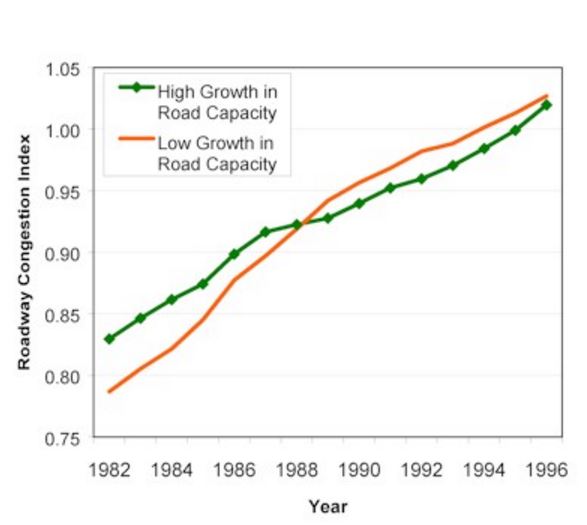 So, when a road is congested, adding more lanes or roads will not relieve congestion, but will likely increase traffic.