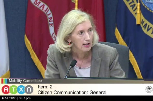 Ann Kitchen chairs City of Austin Mobility Committee meeting of June 14th. Photo: Sceenshot from ATXN video.