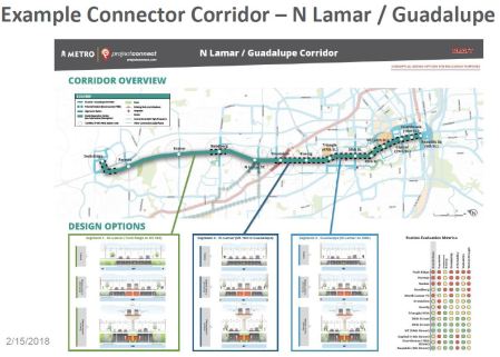 Map and graphics from Project Connect’s Feb. 2018 proposal illustrates possible 12-mile initial light rail line from Tech Ridge (at left end of map) routed south down N. Lamar-Guadalupe corridor to Republic Square in CBD (map is rotated 90°, with north to left and south at right). Other graphics show alignment design options and station attributes. Yet Capital Metro leadership has now withdrawn plan and restarted study process for another two years. Graphics: Project Connect.