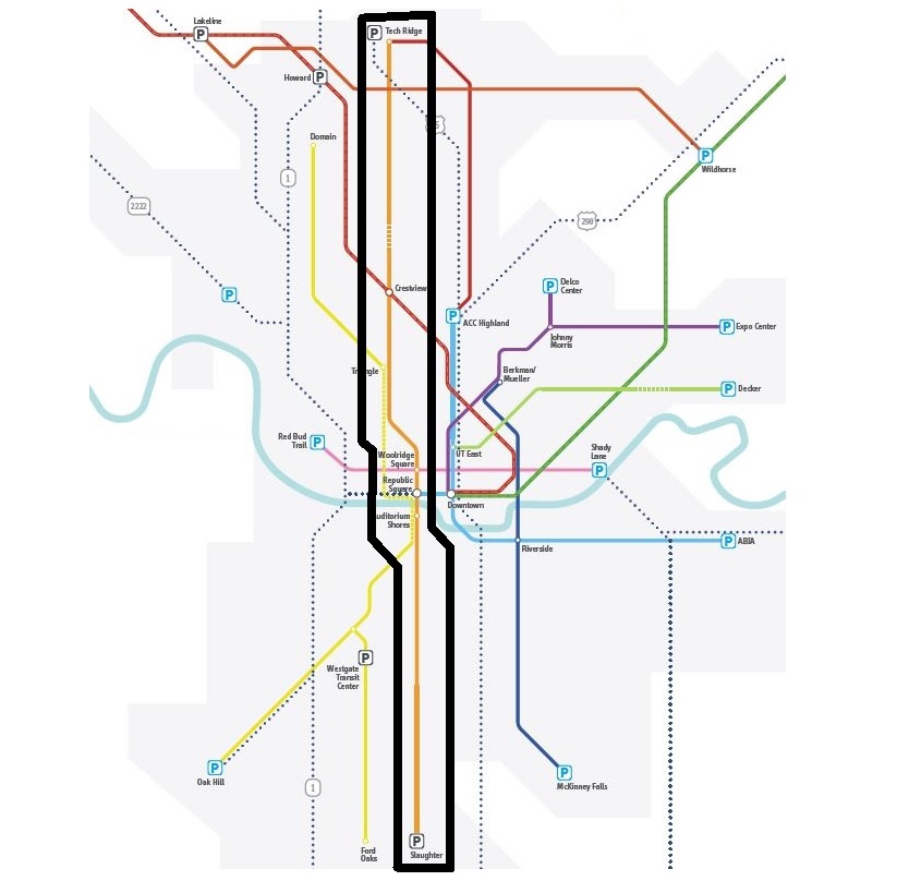 Orange Line (north-south route indicated within black outline) shown within Project Connect’s map of proposed regional system. Excerpted and edited by ARN.