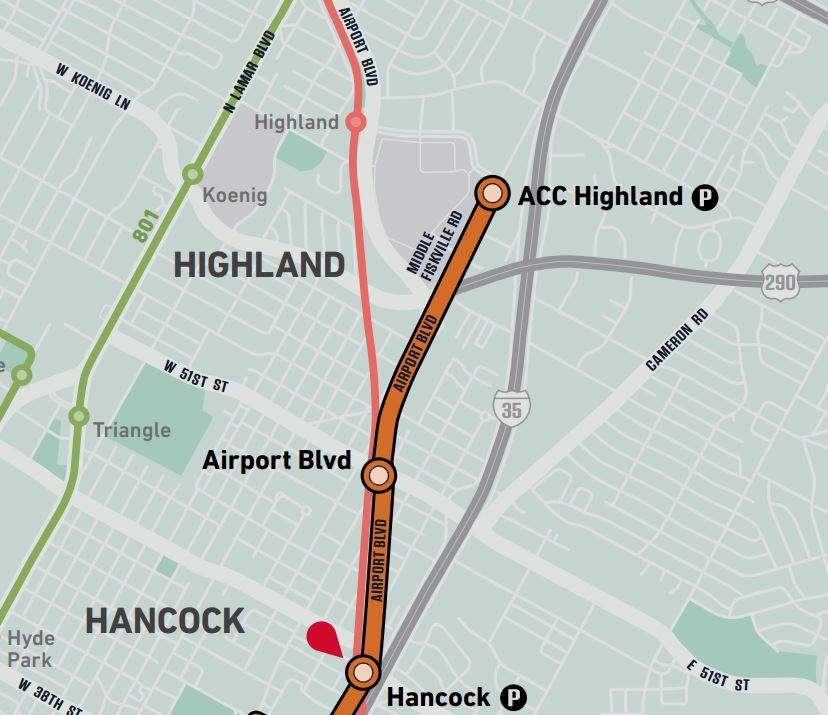 Closeup of Highland ACC segment of Project Connect’s proposed urban rail map shows how the proposed urban rail line (orange) would effectively duplicate the existing MetroRail Red Line paralleling Airport Blvd. (MetroRail drawn as red line, with Highland station shown as red dot near top of map). Project Connect line would terminate at ACC administration building on far east side of campus, with no plans for extension, and no available corridor for extension. Map: Screenshot by ARN, from Project Connect map.