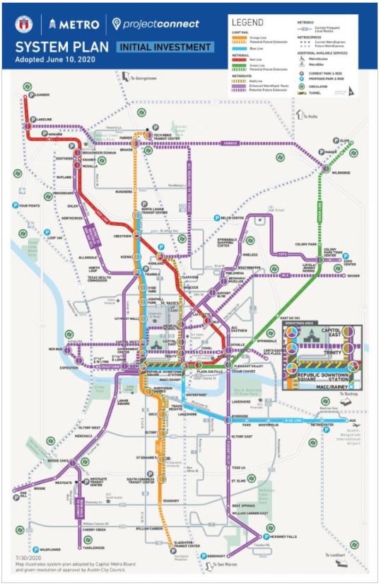 It’s taken over 40 years of proposals, planning, debate, defeats, and delays, but finally, on 3 November 2020, despite the daunting challenges of the global Covid-19 pandemic and massive economic crisis, 58.3% of Austin voters approved a $7.1 billion major transit upgrade and expansion to the Capital Metro (transit authority) system, including a New-Start electric light rail transit (LRT) system for the city. For the initial starter system, two lines are proposed, intersecting in a downtown subway tunnel. About 45% of the capital funding is expected to come from the U.S. Federal Transit Administration. To cover the local 55% share, even in these hard times, voters okayed a modest increase in the local property tax ($0.0875 per $100 valuation).