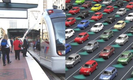 Left: Passengers preparing to board Houston’s Metro light rail. Have “Smart City” visions scuttled Austin’s hopes for urban rail? Right: Simulation of “Smart City” traffic with autonomous and “connected” vehicles. Sources: L. Henry; Propmodo.com.