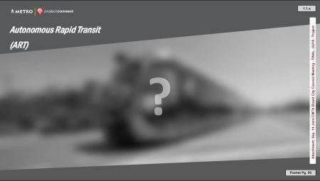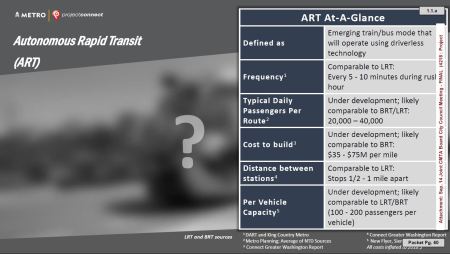 Slide from Feb. 14th Project Connect presentation shows hypothetical “Autonomous Rapid Transit (ART)” as question mark. Since mode is currently imaginary, characteristics and performance claims for it in chart are apparently based on pure speculation. Does a currently fictional technology merit inclusion in a presentation of critical public transport options? Graphic: Project Connect.