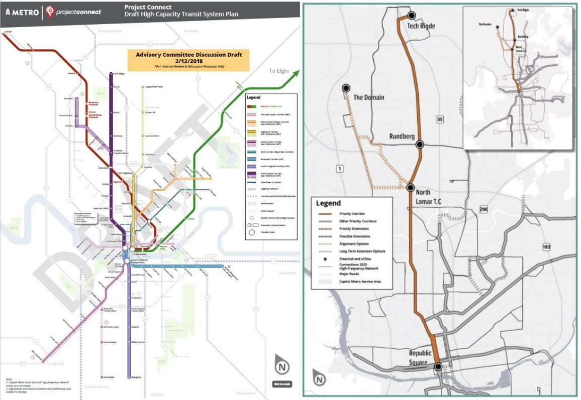 Left: Project Connect draft system plan (presented in Feb. 2018) proposed multiple bus and rail routes, including long north-south light rail line (shown in purple north of the river and lavender to the south) stretching from Tech Ridge to Slaughter Lane. Right: Initial phase of LRT project (proposed Feb. 2018) would run from Tech Ridge to downtown at Republic Square, mainly following the North Lamar-Guadalupe corridor. Maps: Project Connect. (Click to enlarge.)