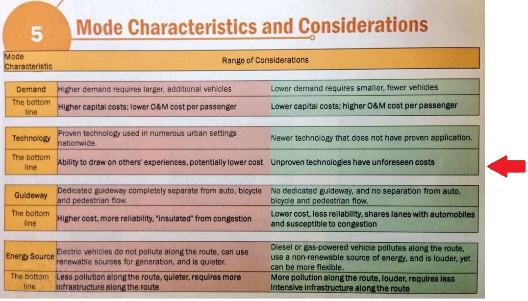 Project Connect chart from 2014 includes warnings (annotated with red arrow) against “Unproven technologies”. Graphic: Project Connect.
