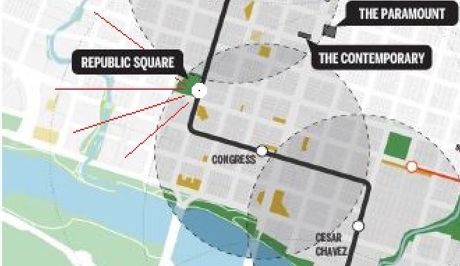 This gap can be filled by a Republic Square station (between W. 4th and 5th Streets), as shown in the graphic above (at the head of this article), which we’ve adapted from the DAA map. On our graphic, red lines radiating westward from the proposed station indicate approximate 4 to 5-minute walk distances to points in this area. Southwest downtown includes such major sites as the Federal Courthouse, the Seaholm development (with various shops and restaurants), the Austin Central Library, and several large condo and apartment highrises. The district also includes a multitude of other establishments, such as smaller shops, hotels, restaurants, and more. A Republic Square LRT station would also be just six blocks from the major westside Whole Foods Market.