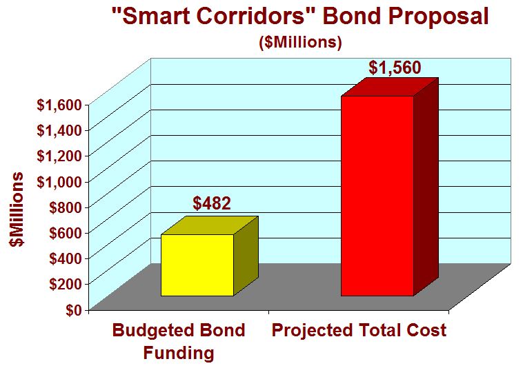 Graph shows disparity between funds budgeted in “Smart Corridors” bond package and projected actual cost of these projects. (Graph: ARN.)