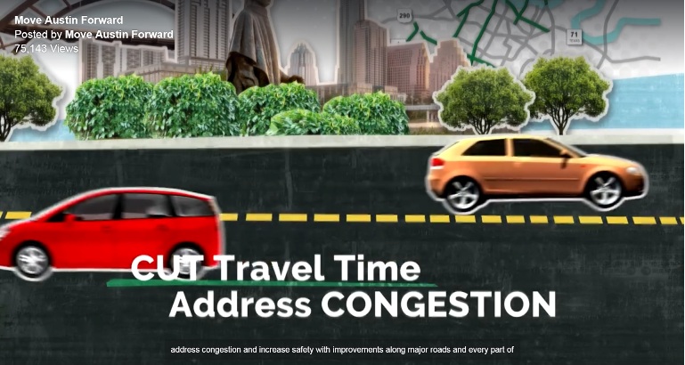 TV ad promoting "Mobility Bond" package focuses on benefits for private motor vehicle traffic.  Graphic: Screenshot of Move Austin Forward TV ad.