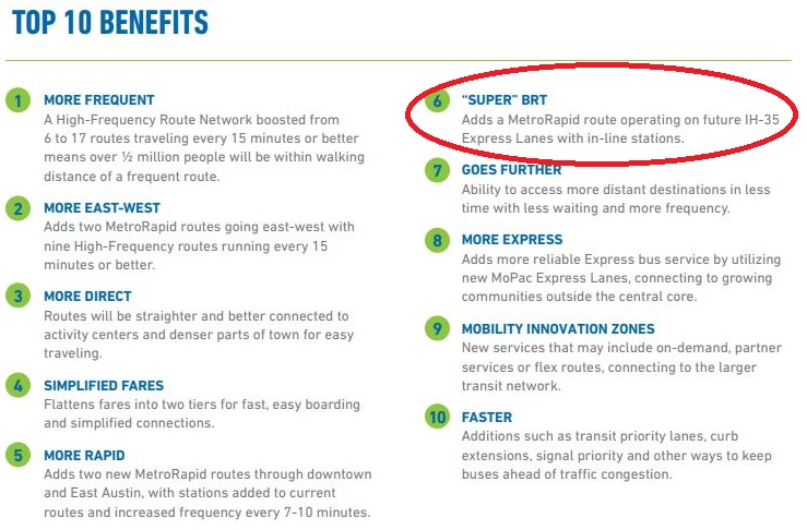 There was no discussion at all of this “Super BRT” project on I-35 during any of the many presentations and speeches during the program, and the very abbreviated public Q&A at the meeting did not permit me to ask for clarification. The only mention in this document of the Guadalupe-Lamar corridor was the continued development and expansion of MetroRapid 801 as well as 803 and additional routes. If they intend to continue to dump cash on the “rapid bus” projects in this corridor, that would effectively preclude serious discussion of a light rail transit (LRT) project in that corridor within the next decade at least.