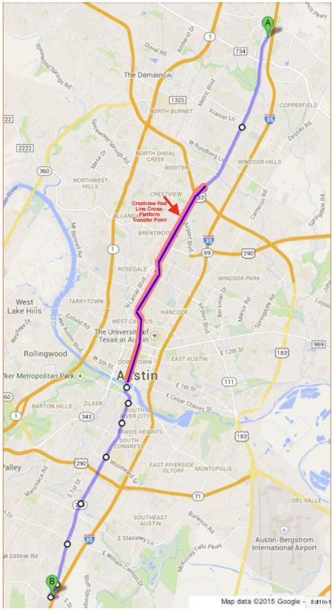 Austin, Texas is a line village whose principle population centers are caught between two major north-south freeways that are rapidly approaching maximum capacity and cannot be meaningfully expanded. The Texas Transportation Institute (TTI) states that failure to adequately address Austin’s future mobility in the IH-35 corridor will essentially shut down economic growth by 2035. [1] This approximately 21-mile-long, one-to-three-mile-wide ribbon of urban population has only one continuous north-south travel corridor that can provide sufficient mobility for future residents – and then only if a well-designed electric urban light rail transit (LRT) line is constructed as a surrogate/alternate to IH-35 from Parmer Lane to Slaughter Lane, primarily routed via North Lamar, Guadalupe, and South Congress