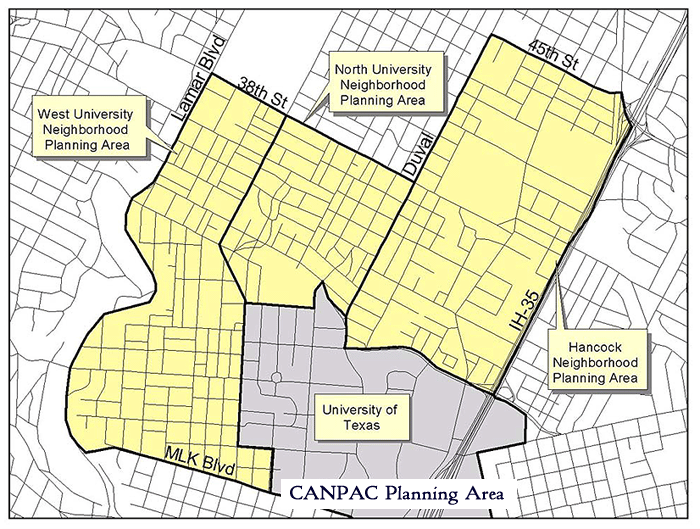 Closeup of Project Connect’s central Austin map of population density for 2010 shows intense clusters of density in West Campus, along Guadalupe above W. 29th St., and in Triangle area. Map: Rev. by LH from Project Connect.