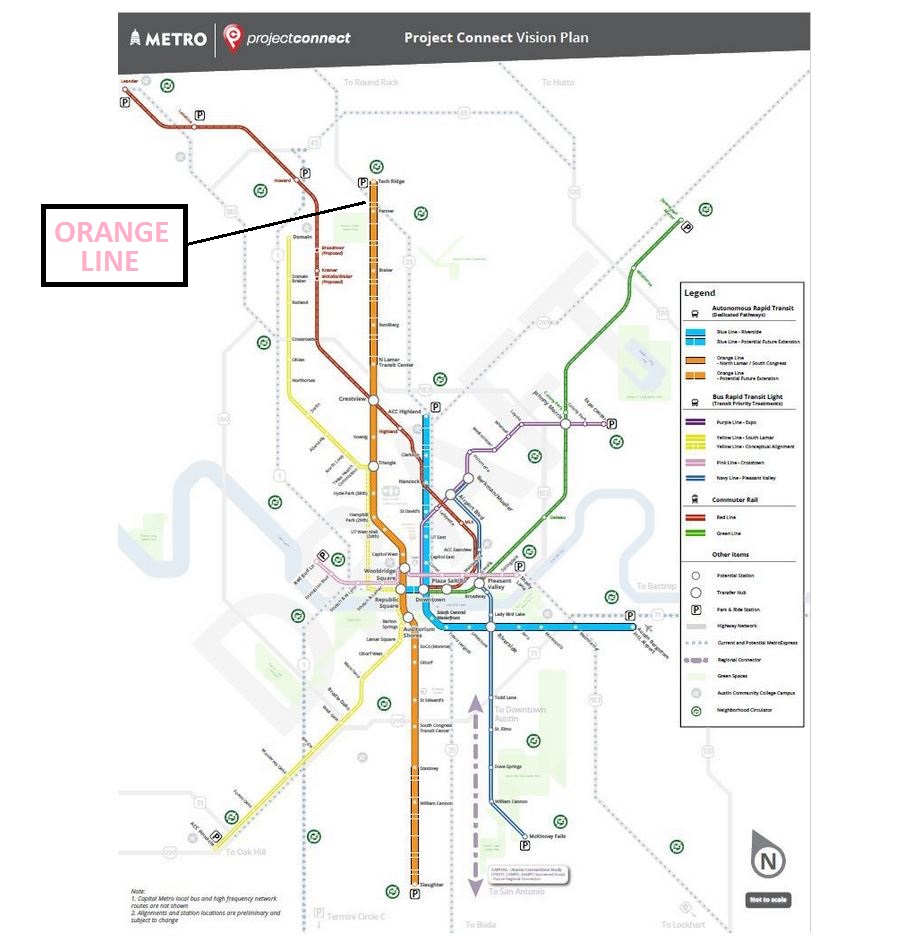 On the South Bank, the Orange Line would branch westward via available real estate and Riverside Drive right-of-way over to South Congress Avenue (a station could be installed in this area to provide approximately 0.4-mile access to Auditorium Shores and the Long Center). Sharing the Blue Line alignment via 4th St./Trinity St. and the proposed transit bridge as an alternative connection from downtown to the South Bank would alone reduce investment cost significantly (perhaps by $1 billion or more). The Orange Line could then proceed into the South Congress corridor either in tunnel or as a surface alignment.