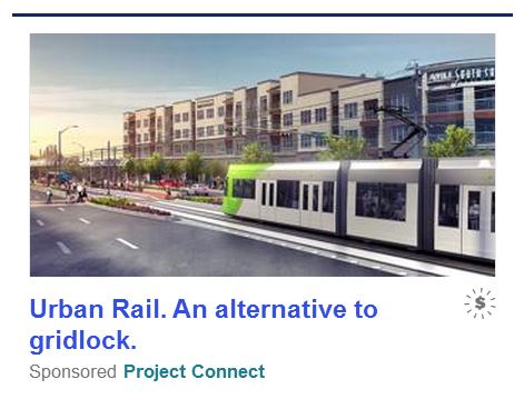 More questions continue to be raised about Project Connect’s tax-funded ad blitz promoting its urban rail plan, almost certainly destined to be placed on the ballot for a vote this November. While this media campaign has intensified into a vigorous television barrage in recent weeks, Project Connect’s online ads — such as the example from a Yahoo.com News page at the top of this post — have been peppering webpages on the Internet for months